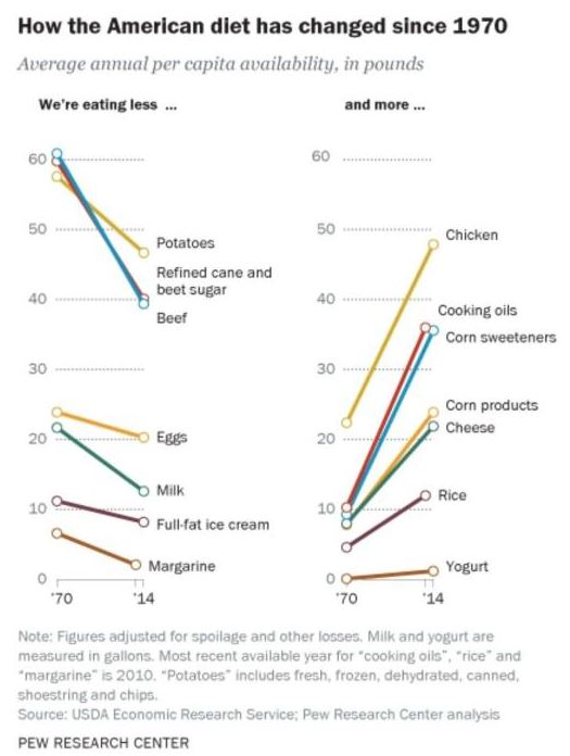For example, we can see that before 1970, the American diet was largely composed of beef, potatoes, eggs, and milk. Now it's predominantly chicken, cooking oils, and corn.