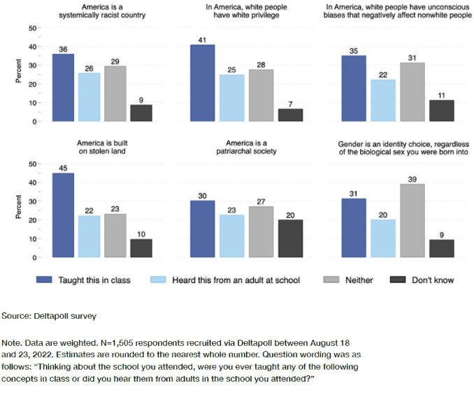 The Manhattan Institute did a study on Critical Race Theory (CRT) and Gender Theory being taught in K-12 schools. They found that over 30% of students were actively being taught these concepts, with over 60% hearing about it in school from adults.
