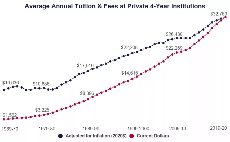 Because all federal student loans are insured by the government, the average annual tuition & fees for public schools have 5x'd or more, with private institutions having 10x'd in current dollar terms!