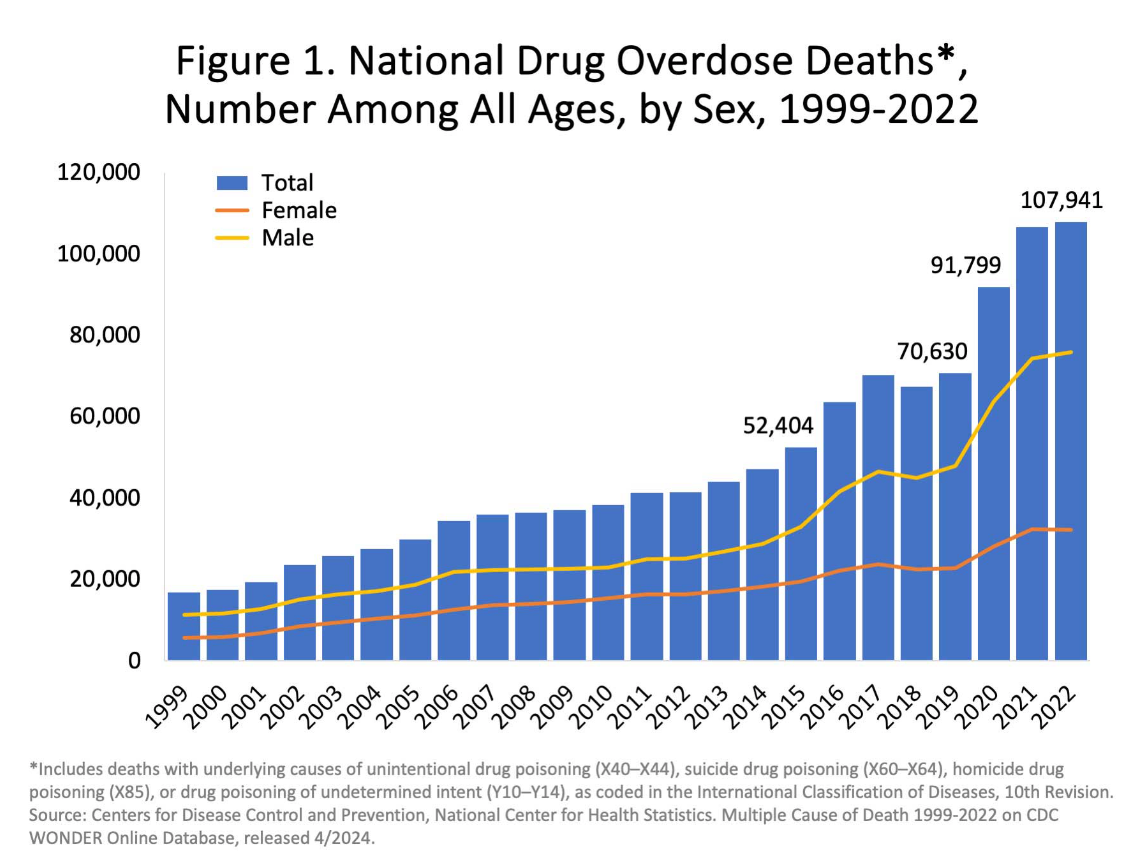 We can see a more isolated chart of the spike in drug overdoes deaths across all ages.