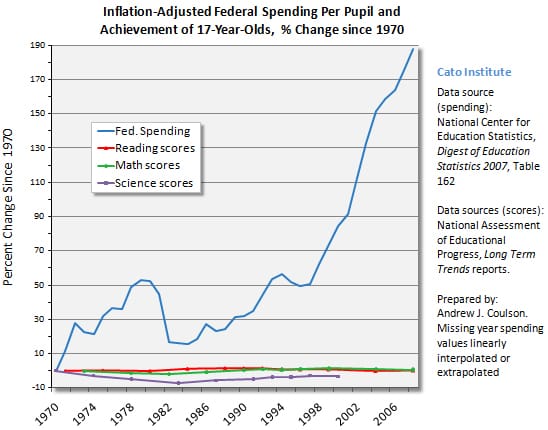 You can see that federal spending on education has increased rapidly and yet reading, math, and science scores have effectively remained unchanged.