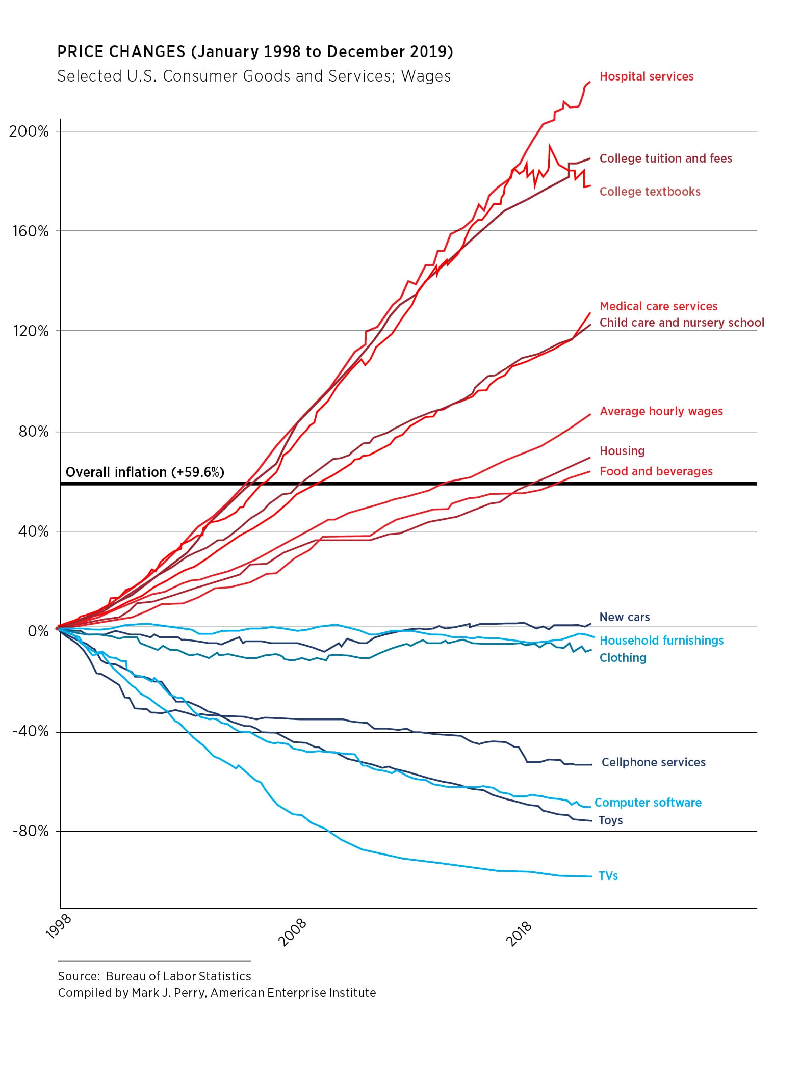 The chart below shows the changes in the cost of goods and services from 1998 to 2019.